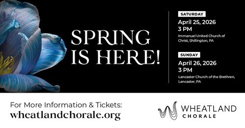 The Wheatland Chorale will present their next concert series “Spring is Here!” on Saturday, April 25th - 3:00 p.m. at Immanuel UCC in Shillington and Sunday, April 26th - 3:00 p.m. at Lancaster Church of the Brethren. Come and enjoy a varied musical program as the group performs music that will bring you into the newness of the season. The chorale is one of the renowned vocal ensembles in the region, known for its beautiful artistry and quality programming. Audience members will be treated to musical renderings with moments of gentle beauty, uplifting celebration, and radiant harmonies that remind us of the fresh beginnings spring brings each year. Join us for an afternoon of inspiring choral music of Haydn, Bernstein, Britten and many others, that celebrates the beauty of the season and the power of voices raised together in song. Tickets can be purchased ahead of time on their website: wheatlandchorale.org. Groups of six or more: $20.00 Single adult: $25.00 Students: $10.00