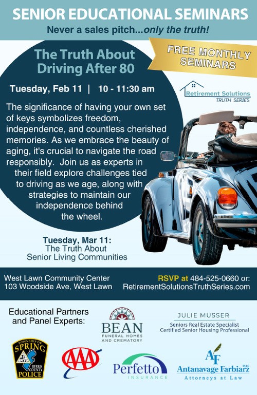 On Tuesday, February 11th, Retirement Solutions for Seniors will present The Truth About Driving After 80: Strategies to Keep You Safe Behind the Wheel. This seminar will be presented by a driving instructor from AAA ReadingBerks. AAA offers tests for seniors to help lower insurance costs, or if someone has been told they have to retake their test to prove they can still drive.