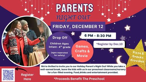 The West Lawn Preschool is thrilled to invite you to our Holiday Parent’s Night Out! While you take a well-earned break, leave the kids with us in our preschool classrooms/nursery for a fun-filled evening. Food, drinks and entertainment provided for children ages Infants-4th grade. All families must register online or by paper form no later than December 10. Children will be separated out by age as to provide a safe and fun environment for all!